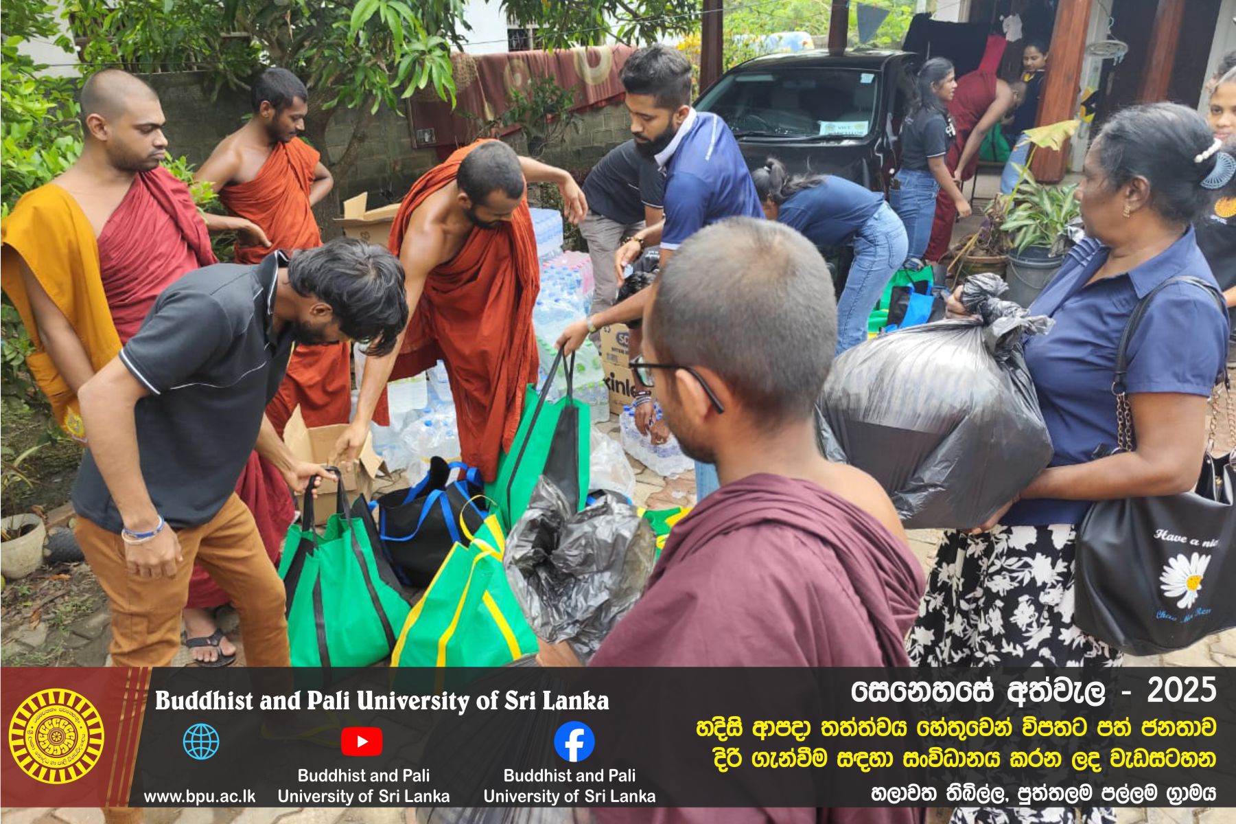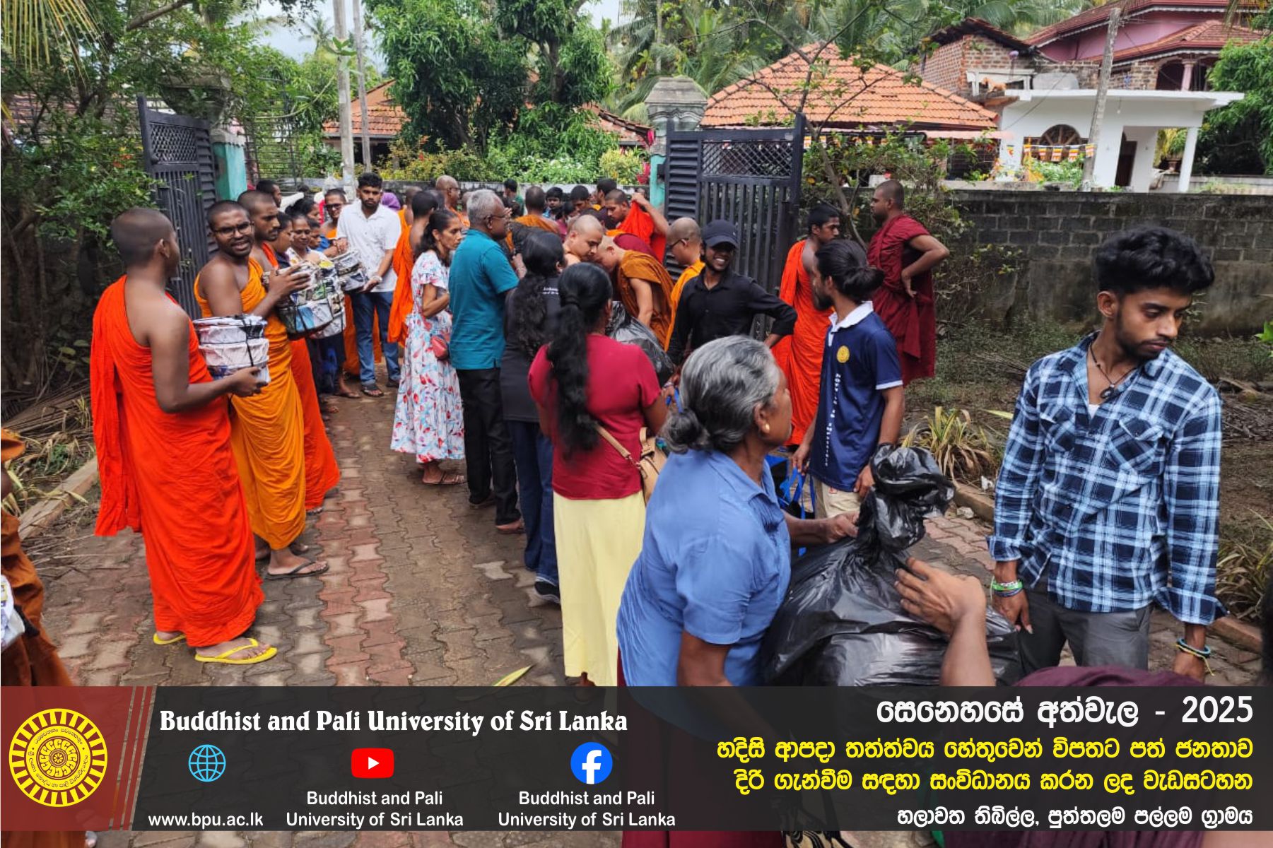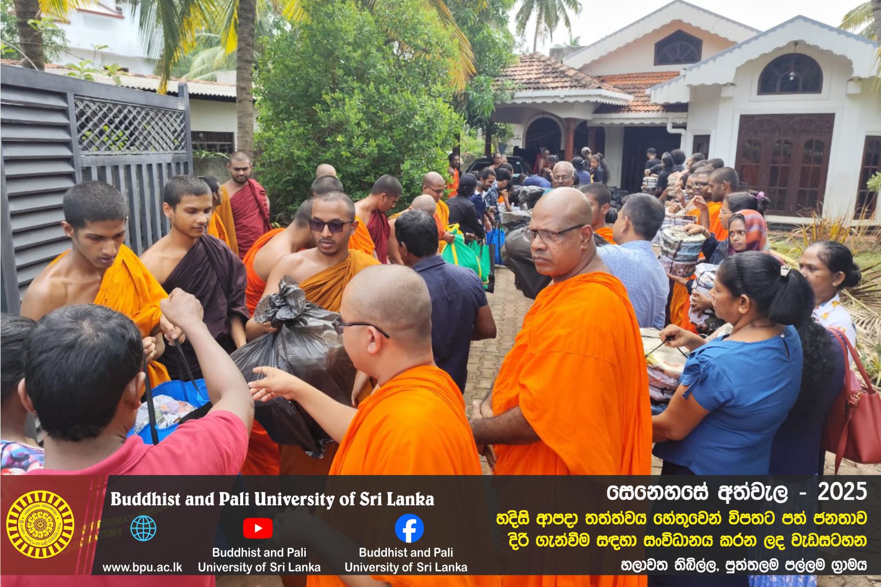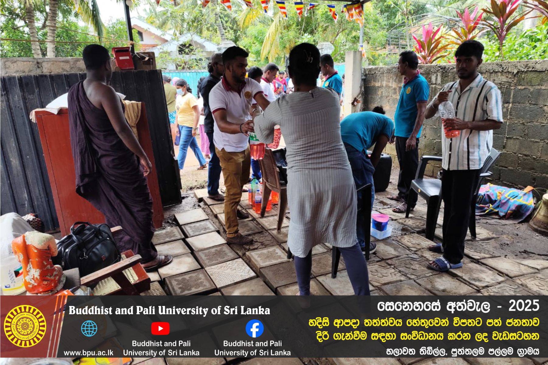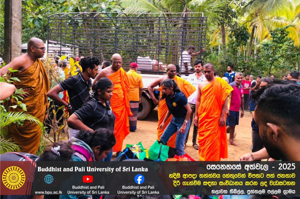 හදිසි ආපදා තත්ත්වය හේතුවෙන් විපතට පත් ජනතාව දිරි ගැන්වීම සඳහා ශ්රී ලංකා බෞද්ධ හා පාලි විශ්වවිද්යාලයේ අභ්යන්තර/බාහිර විද්යාර්ථීන් සහ අධ්යයන/අනධ්යයන කාර්ය මණ්ඩලය සංවිධානය කරන ලද වැඩසටහන හලාවත තිබිල්ල, පුත්තලම පල්ලම ග්රාමය, පල්ලම ප්රාථමික විද්යාලය කේන්ද්රගතව 2025 දෙසැම්බර් 12 වන දින පැවැත්විය.