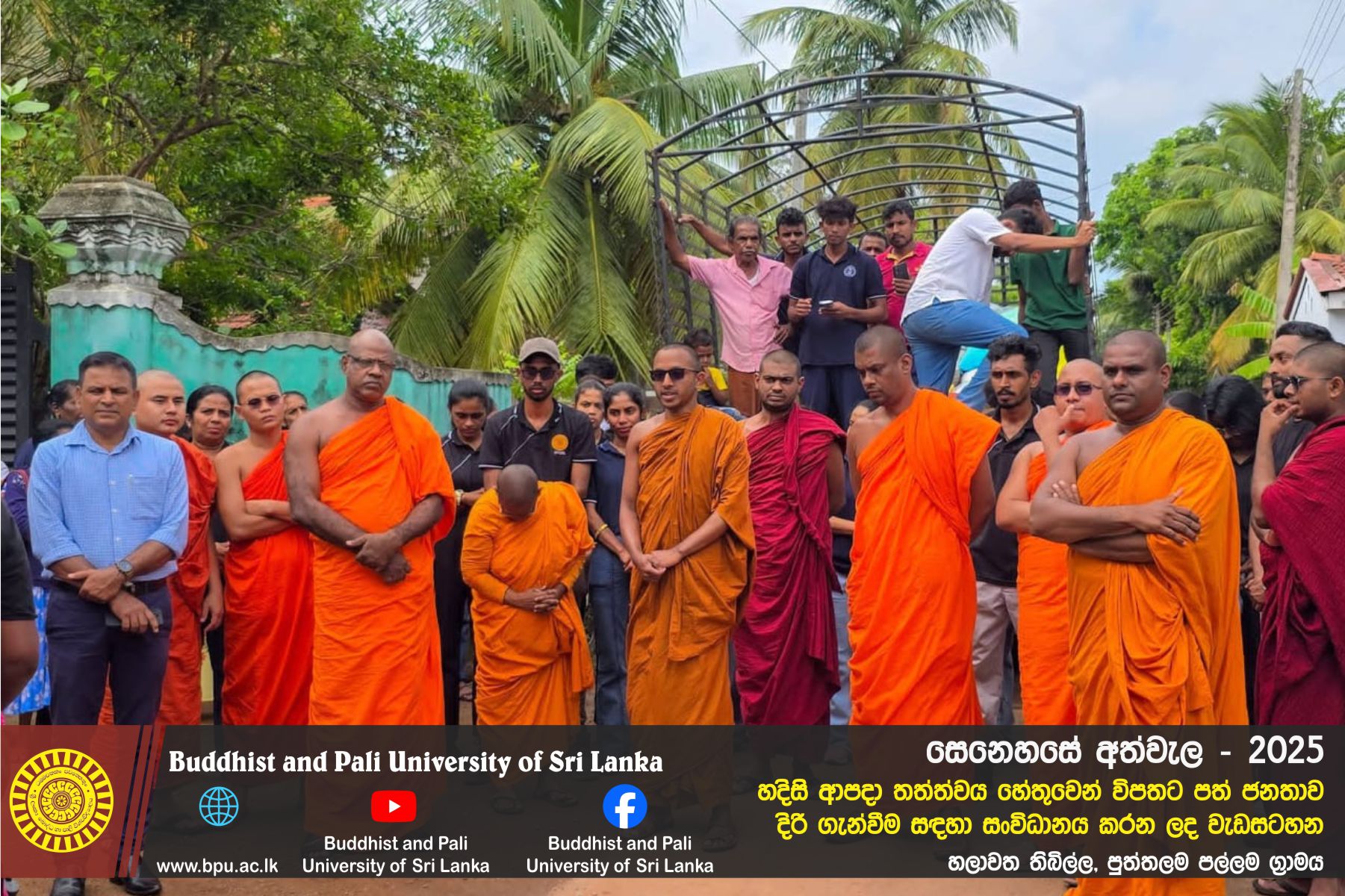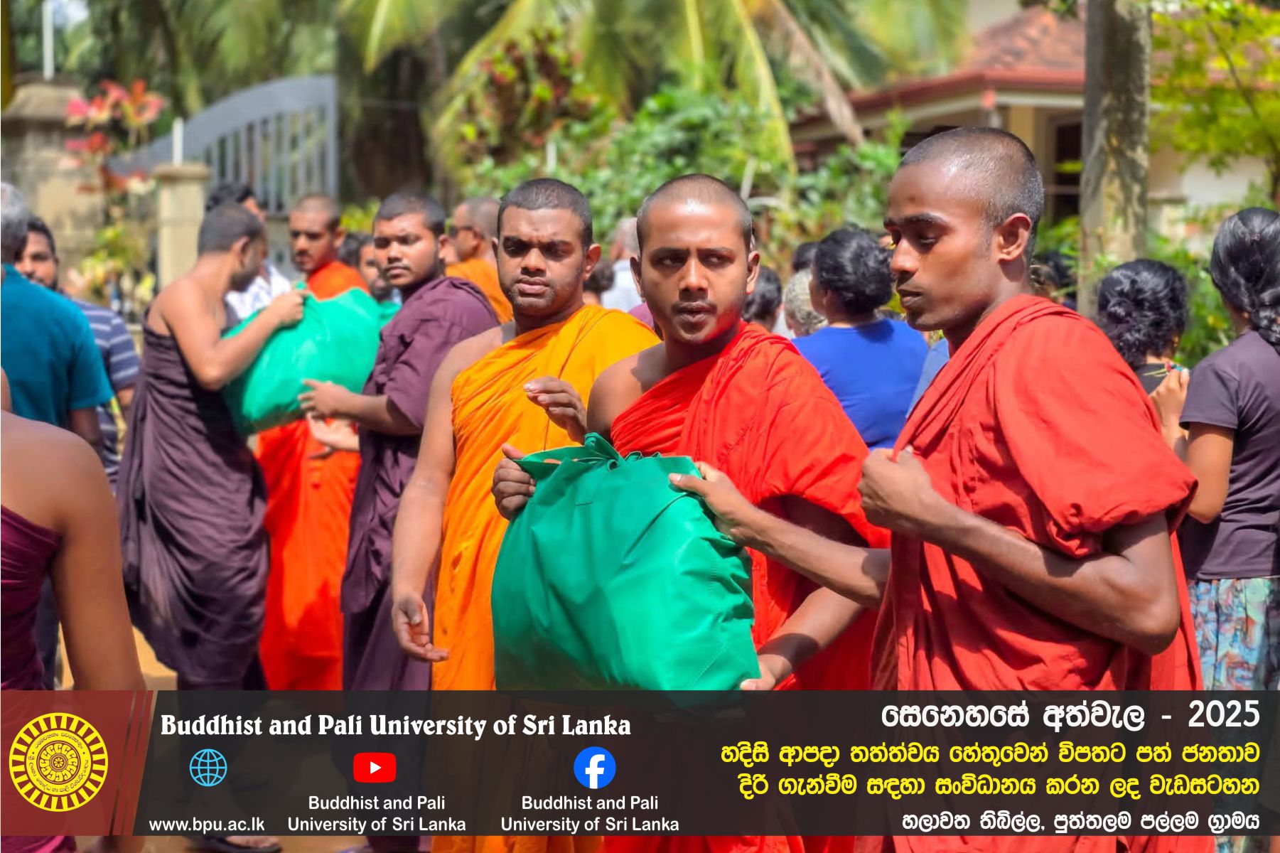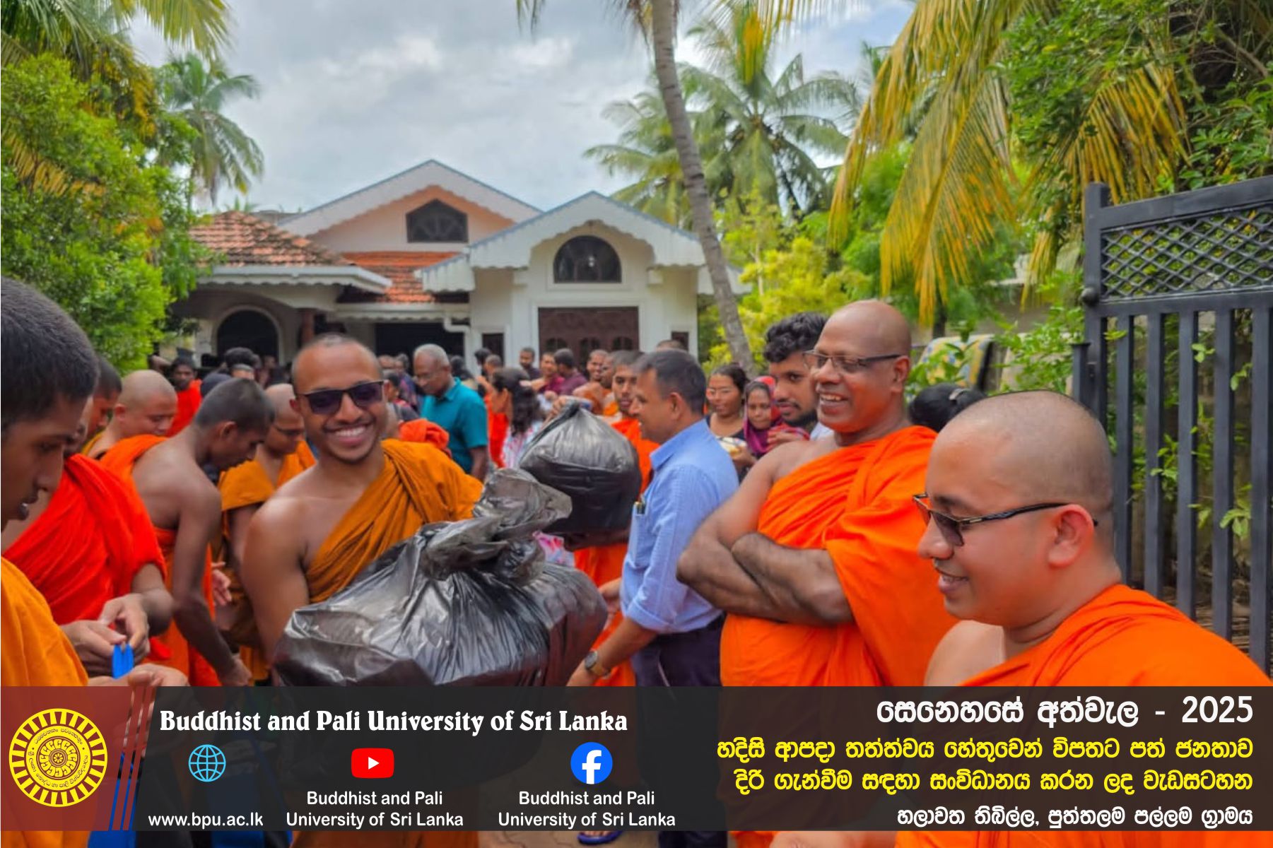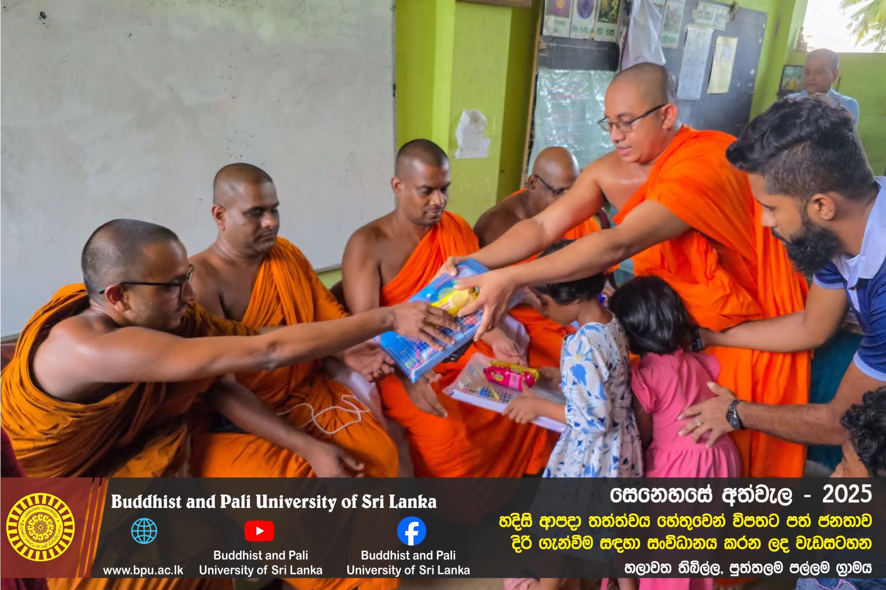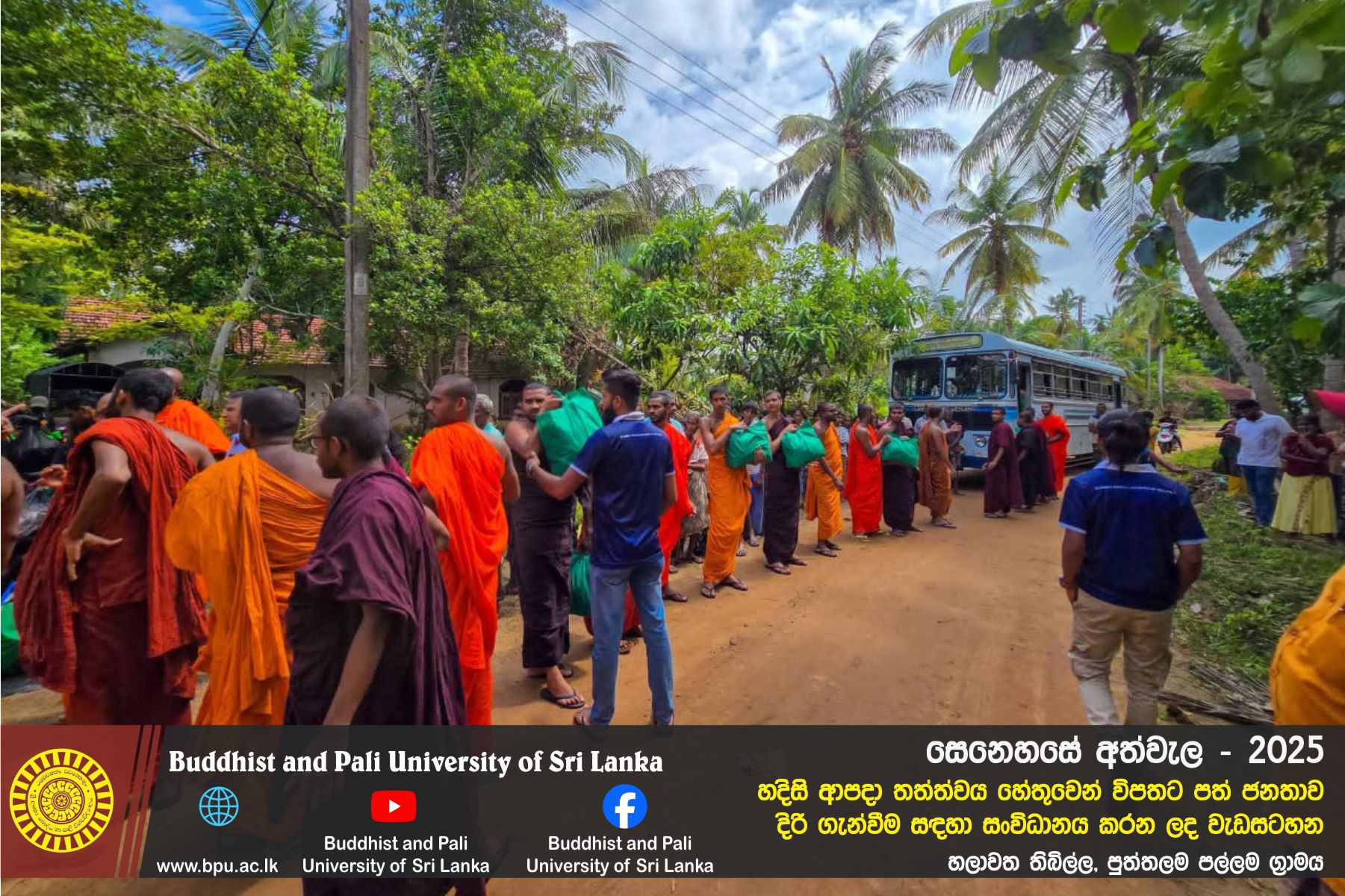 හදිසි ආපදා තත්ත්වය හේතුවෙන් විපතට පත් ජනතාව දිරි ගැන්වීම සඳහා ශ්රී ලංකා බෞද්ධ හා පාලි විශ්වවිද්යාලයේ අභ්යන්තර/බාහිර විද්යාර්ථීන් සහ අධ්යයන/අනධ්යයන කාර්ය මණ්ඩලය සංවිධානය කරන ලද වැඩසටහන හලාවත තිබිල්ල, පුත්තලම පල්ලම ග්රාමය, පල්ලම ප්රාථමික විද්යාලය කේන්ද්රගතව 2025 දෙසැම්බර් 12 වන දින පැවැත්විය.