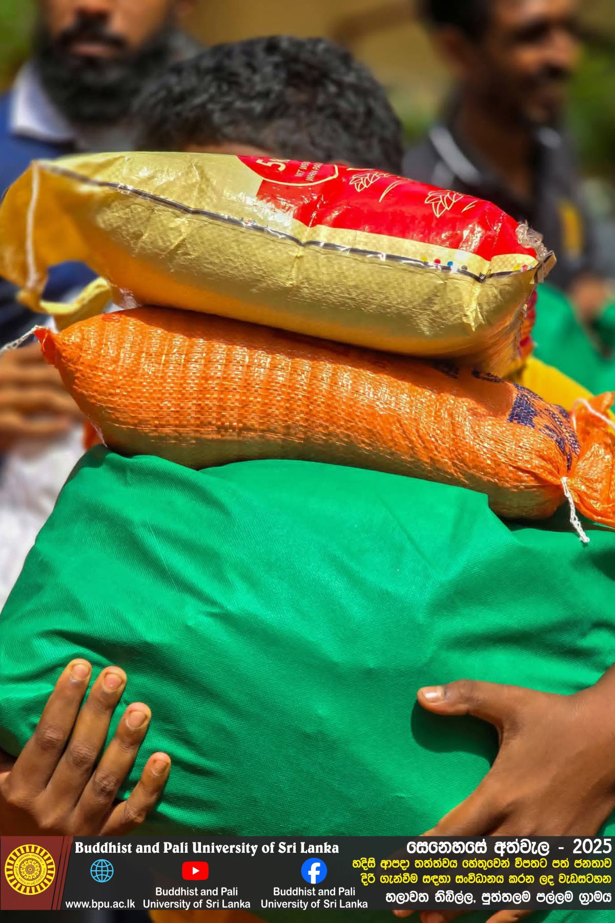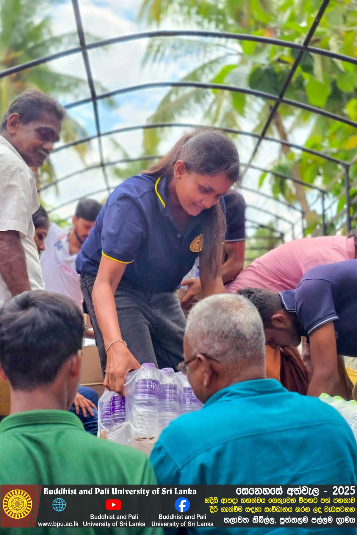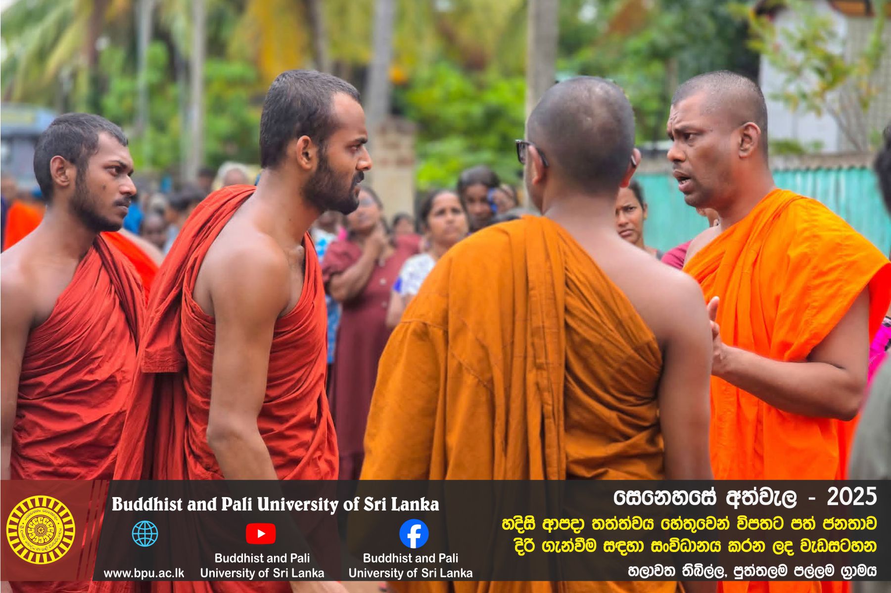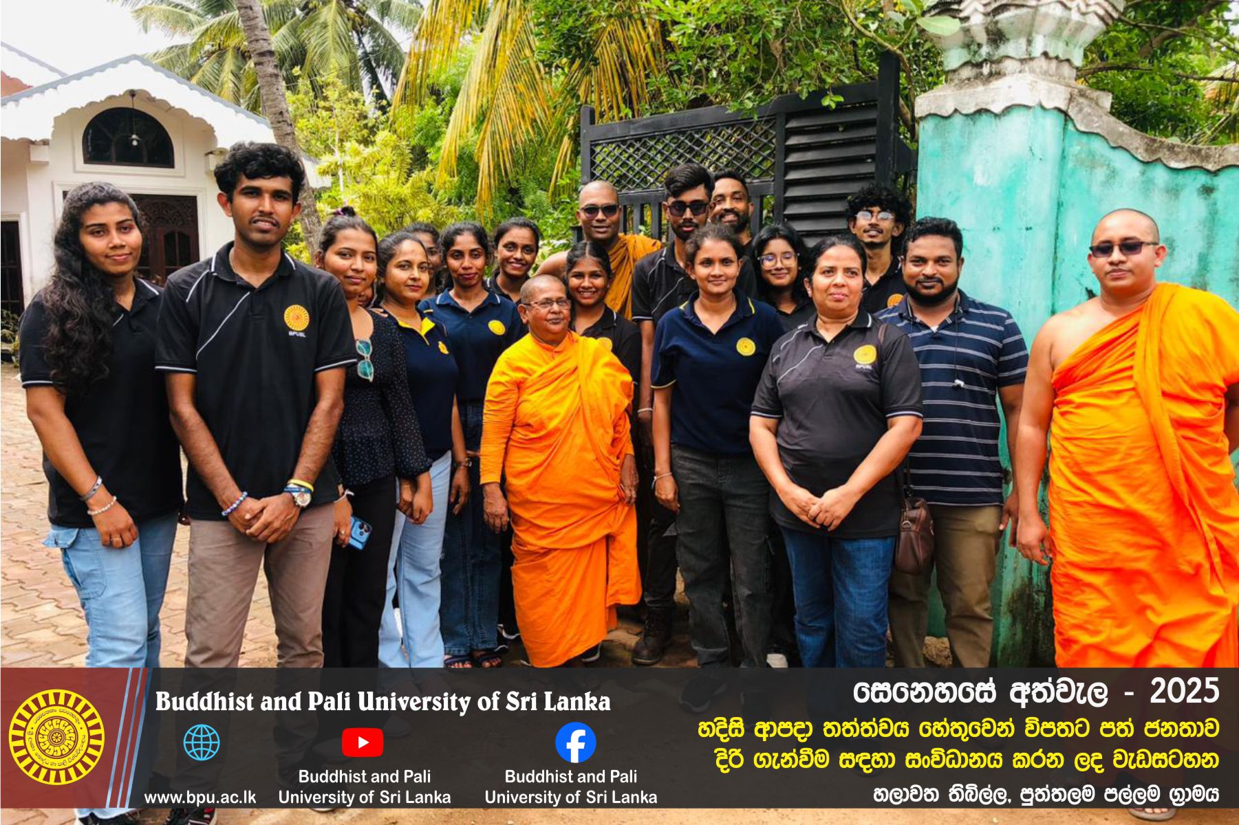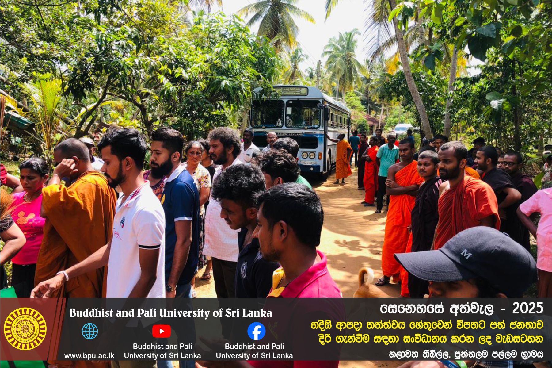 හදිසි ආපදා තත්ත්වය හේතුවෙන් විපතට පත් ජනතාව දිරි ගැන්වීම සඳහා ශ්රී ලංකා බෞද්ධ හා පාලි විශ්වවිද්යාලයේ අභ්යන්තර/බාහිර විද්යාර්ථීන් සහ අධ්යයන/අනධ්යයන කාර්ය මණ්ඩලය සංවිධානය කරන ලද වැඩසටහන හලාවත තිබිල්ල, පුත්තලම පල්ලම ග්රාමය, පල්ලම ප්රාථමික විද්යාලය කේන්ද්රගතව 2025 දෙසැම්බර් 12 වන දින පැවැත්විය.